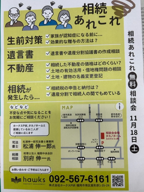 ホークスPM > 株式会社ホークスPMのスタッフブログ記事一覧 > 相続あれこれ 無料相談会♪